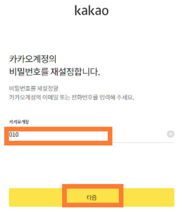 - 비밀번호 재설정을 위해 카카오 계정 이메일 혹은 전화번호를 입력하고 다음을 누릅니다.