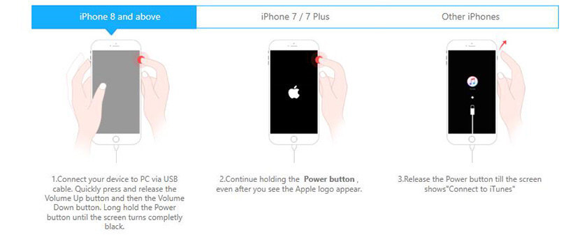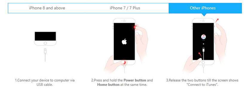 iTunes가 나타날 때까지 적절한 작업을 통해 iPhone을 강제로 다시 시작합니다. 구체적인 작동 방식은 사용한 아이폰에 따라 다릅니다. 그리고 다음은 구체적인 내용입니다. 또한 위에 언급된 iOS 시스템 복구 소프트웨어를 사용하여 클릭 한 번으로 복구 모드로 진입합니다.