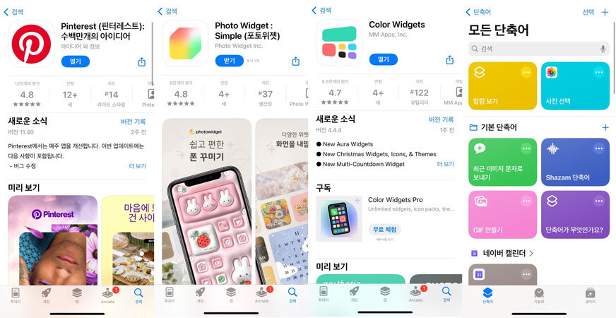 아이폰 홈화면 꾸미기 및 아이폰 홈화면 추가를 하기 위해서 유용한 어플을 네가지 추천 드리겠습니다. 바로 핀터레스트, 포토위젯, 컬러위젯, 단축어 어플인데 단축어는 기본적으로 설치되어 있기 때문에 다운로드 받을 필요가 없으며 Pinterest, Colorwidget Photowidget의 경우는 따로 다운로드를 받으면 감성 넘치는 예쁜 아이폰 홈화면 바꾸기가 가능합니다.