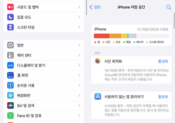 아이폰 설정> 일반> 아이폰 저장공간> 저장공간 확인후 없을 경우 데이터 삭제하기