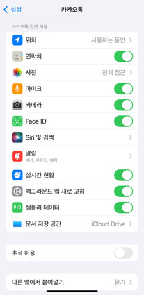 설정> 카카오톡> 카카오톡 접근 허용> 카메라와 마이크 사용 허용하기