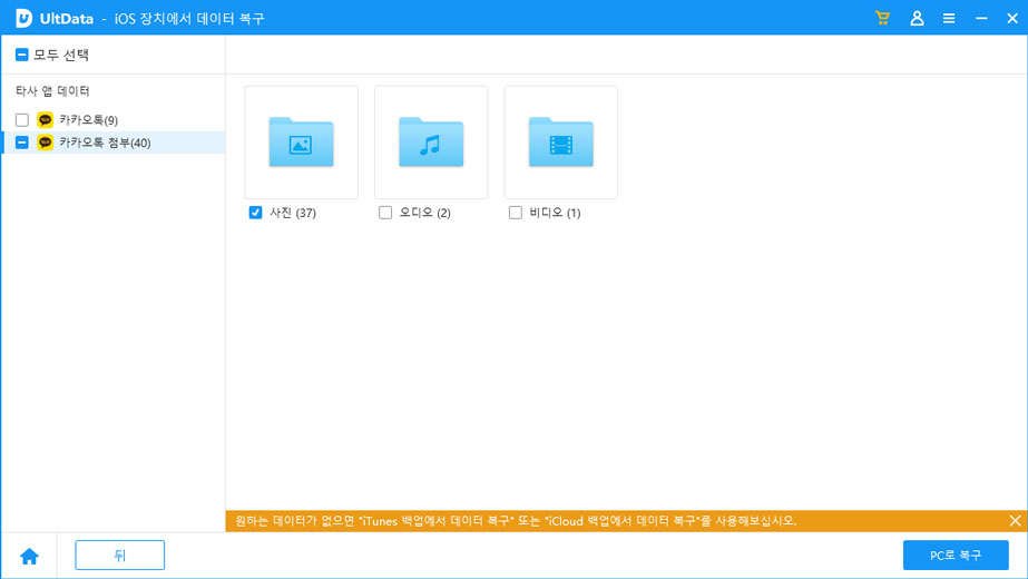 이제 UltData가 스캔한 모든 카카오톡 데이터와 대화내용이 나열됩니다. 복구할 데이터를 미리보고 카테고리별로 선택할 수 있습니다. 원하는 모든 데이터를 선택하신 후 "PC로 복구"를 선택하시면 복구가 진행됩니다.