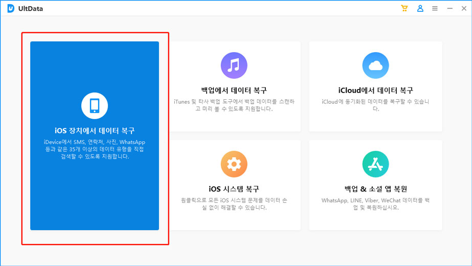 UltData 프로그램을 다운로드 후 실행하여 메인 화면에서 "iOS 장치에서 데이터 복구"를 선택해 줍니다. 카카오톡 데이터를 복구하기 위해서는 iOS장치를 컴퓨터에 연결해 줍니다.