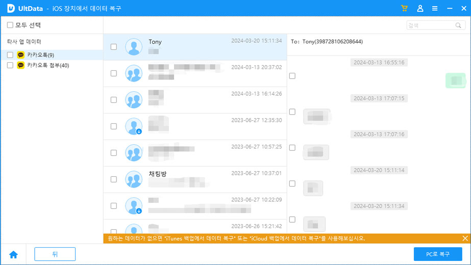 이제 UltData가 스캔한 모든 카카오톡 데이터와 대화내용이 나열됩니다. 복구할 데이터를 미리보고 카테고리별로 선택할 수 있습니다. 원하는 모든 데이터를 선택하신 후 "PC로 복구"를 선택하시면 복구가 진행됩니다.