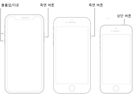 - 아이폰 6S 및 이전 모델 사용자는 공장초기화 하려면 측면 버튼과 상단 버튼을 동시에 계속 누르고 있어야 합니다.