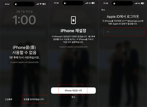 여러 번 잘못된 비밀번호를 입력하다 보면 아이폰을 사용할 수 없음