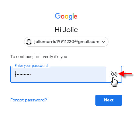 4. 이제 아이디와 비밀번호가 저장되어 있는 구글 계정 로그인 페이지로 이동됩니다. 비밀번호 창 끝에 있는 “비밀번호 표시” 버튼을 누르면 비밀번호가 보이게 됩니다.