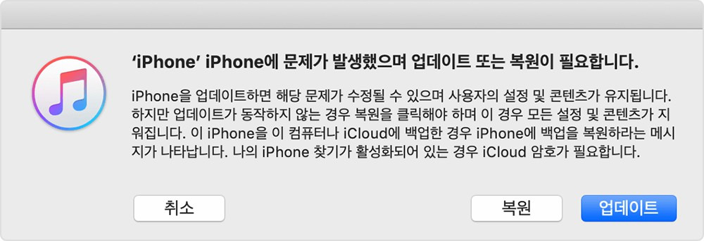 - 아이폰의 복구모드를 iTunes가 인식하여 아이폰에 업데이트나 복구가 필요하다는 안내가 나옵니다.