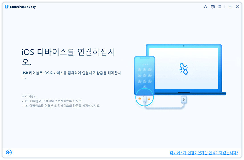 - Tenorshare 4uKey를 다운로드하고 설치하여 아이폰을 컴퓨터에 연결하고, 프로그램을 실행합니다.