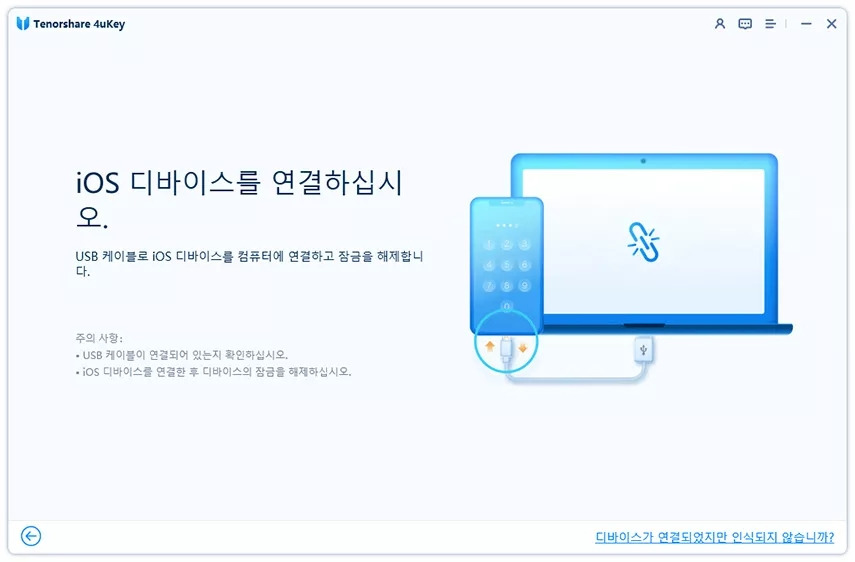 1. 먼저, Tenorshare 4uKey를 다운로드하여 설치하고 아이폰을 컴퓨터에 연결해 주세요.