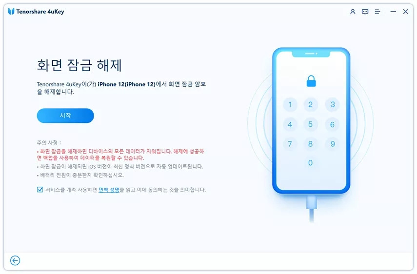 1. 먼저 Tenorshare 4uKey(테너쉐어 포유키)를 컴퓨터에 설치한 후 실행해 주세요. 번개 케이블로 iPad를 연결한 다음, ‘시작’ 버튼을 클릭합니다.