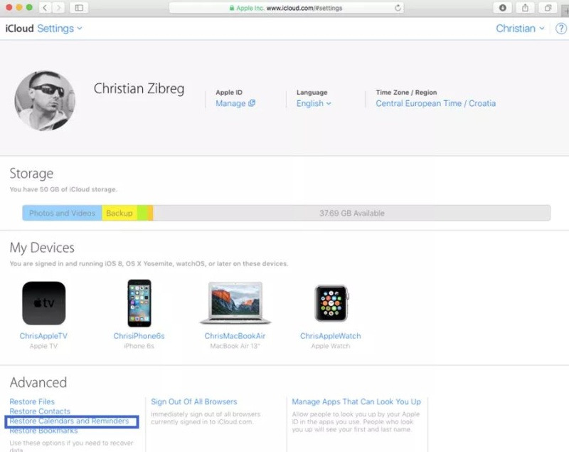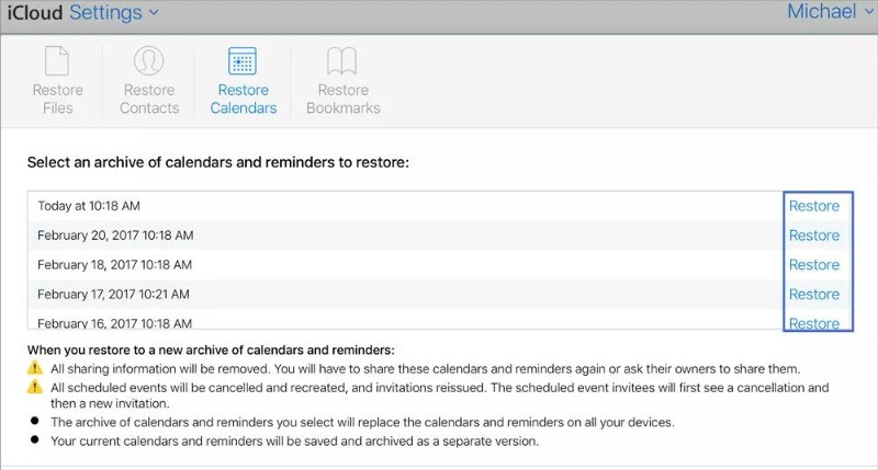 - iCloud.com에서 계정 설정으로 이동한 후, '고급' 버튼을 클릭하고 '캘린더 및 알림 복원' 버튼을 누릅니다.