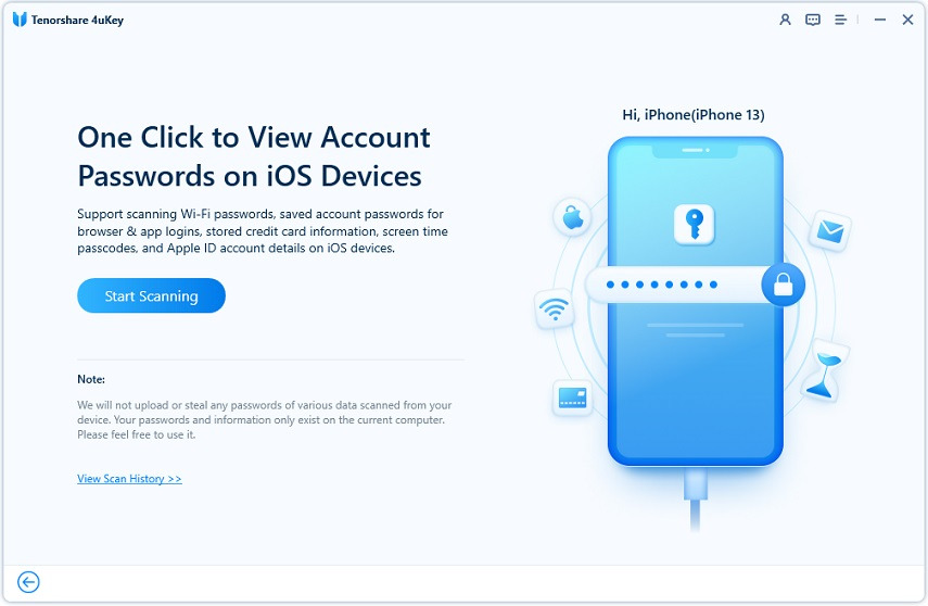 - 아이폰 또는 아이패드를 USB 케이블로 컴퓨터에 연결합니다. "스캔 시작"을 클릭하여 비밀번호를 검색합니다. "스캔 기록 보기 >>"를 클릭하여 스캔한 모든 기록을 확인할 수도 있습니다.