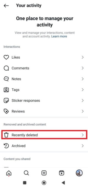 따라서 가장 먼저 해야 할 일은 인스타그램에서 "최근 삭제된 항목" 폴더로 이동하여