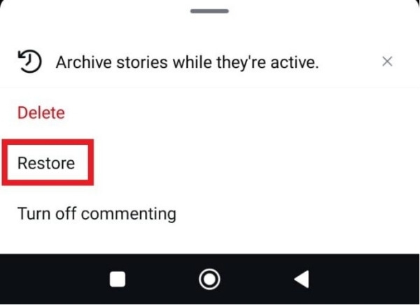 - 복구하려는 스토리를 클릭하고, 하단의 3개의 점 아이콘을 탭한 후 복원을 클릭합니다. 삭제된 스토리는 아카이브 폴더로 복원됩니다.