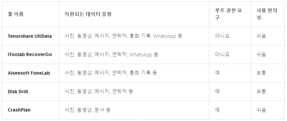 위에서 언급한 모든 데이터 복구 도구를 간단히 비교한 표입니다.