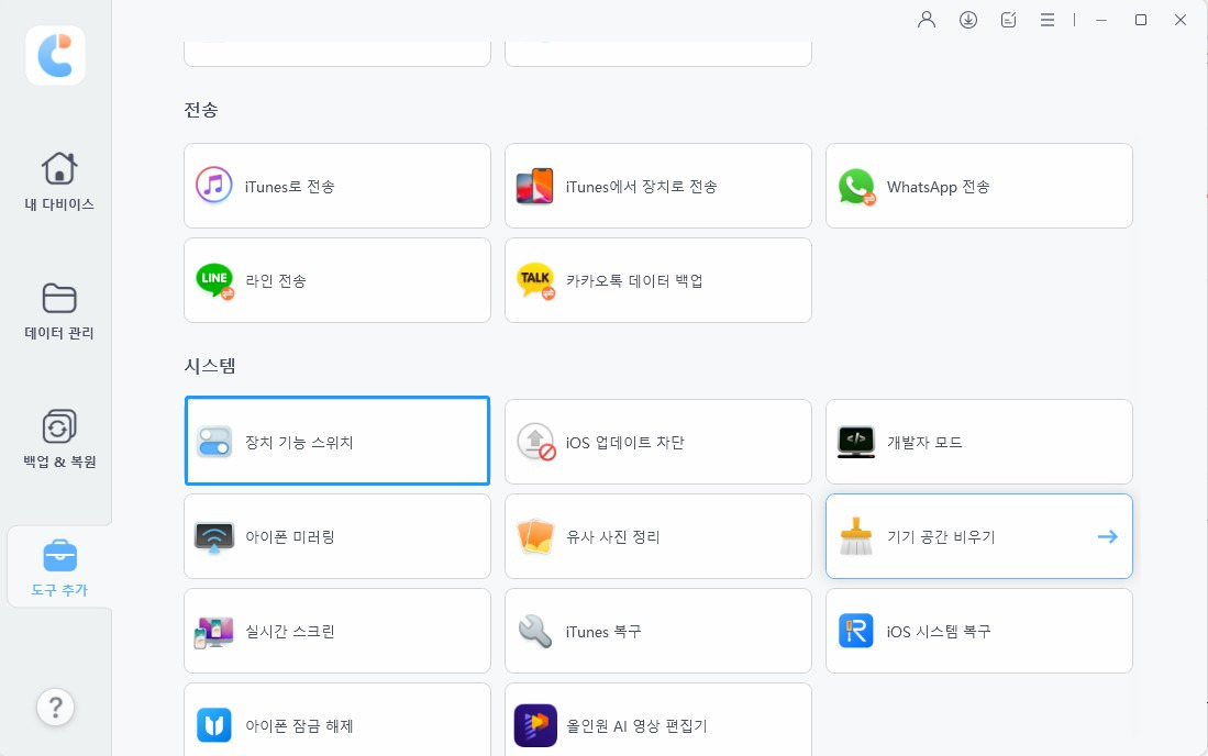- 위 버튼을 클릭해 컴퓨터에 iCareFone(아이케어폰)을 다운로드하고 설치합니다. 그런 다음 아이폰을 컴퓨터에 연결하고 iCareFone(아이케어폰)을 실행합니다. 소프트웨어의 기본 인터페이스가 표시됩니다.