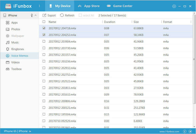- 왼쪽 카테고리에서 보려는 파일 유형을 선택하십시오. 여기서는 '음성 메모'를 예로 들어 보겠습니다. 이제 원하는대로 파일을 가져 오거나 내보내거나 삭제할 수 있습니다.