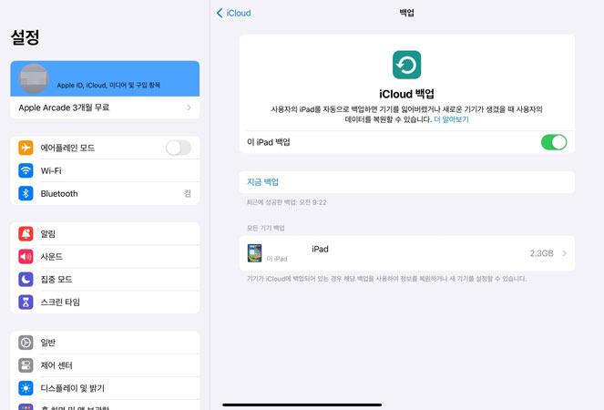 아이패드 설정> 애플 아이디> iCloud> iCloud 백업> 지금 백업 터치