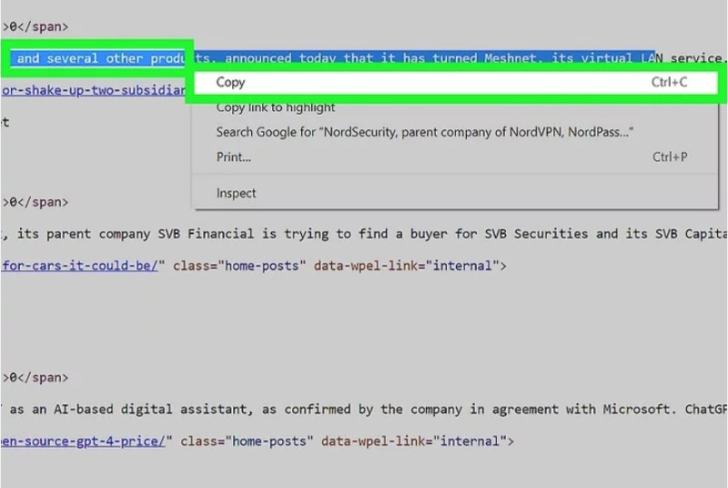 3. 텍스트 찾기 및 복사. 소스 코드를 스크롤하여 필요한 텍스트를 찾아 마우스로 강조 표시한 후, Ctrl + C(PC) 또는 Cmd + C(Mac)를 눌러 복사하세요. 그런 다음 원하는 곳에 붙여넣을 수 있습니다.