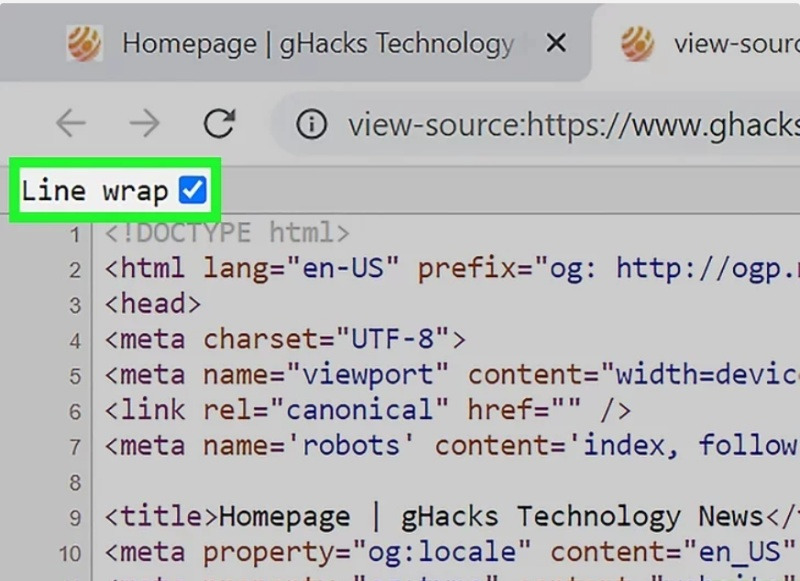 2. 줄바꿈 활성화(가능한 경우). Chrome이나 Edge 같은 Chromium 기반 브라우저를 사용하는 경우, 창 좌측 상단에서 “줄바꿈” 옆의 체크박스를 선택해 텍스트를 더 쉽게 읽을 수 있도록 설정하세요. Firefox에서는 소스 코드의 빈 공간을 우클릭하고 긴 줄 줄바꿈을 선택하세요.