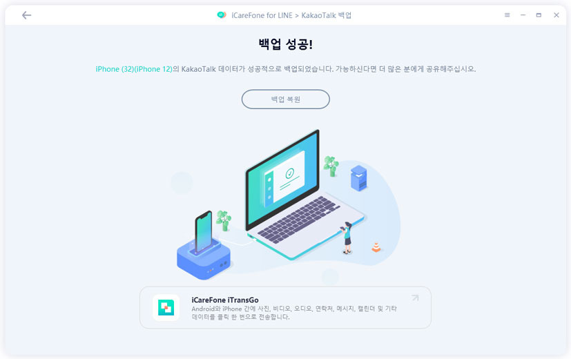카카오톡 사용을 위한 iCareFone는 iOS기기간의 카카오톡 채팅 기록 백업, 복원, 이동할 수 있습니다.