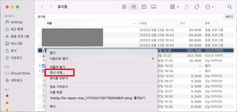 다른 사람에게 보여주고 싶지 않은 파일이나 불필요한 데이터를 삭제하고 싶은 경우, 일부 데이터만 완전 삭제할 수 있습니다. Mac의 휴지통에서 수동으로 완전히 삭제합니다. 휴지통으로 이동한 뒤, 불필요한 데이터를 '즉시 삭제' 기능으로 개별적으로 지워줍니다.