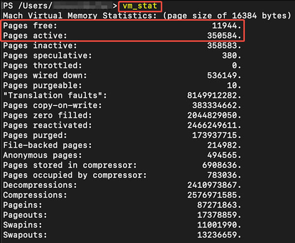 - 다음으로 상세 메모리 통계 를 vm_stat 명령으로 확인합니다: vm_stat 출력은 페이지 단위로 메모리 사용량을 표시하며(바이트로 변환하려면 4KB를 곱함), "사용 가능 페이지"는 사용 가능한 RAM을, "활성 페이지"는 현재 사용 중인 RAM을 의미합니다.