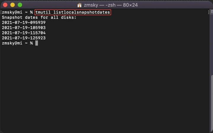 - 응용 프로그램 → 유틸리티 → Terminal에서 Terminal 을 열고 " tmutil listlocalsnapshotdates "를 입력한 후 Enter를 눌러 모든 로컬 스냅샷을 확인합니다.