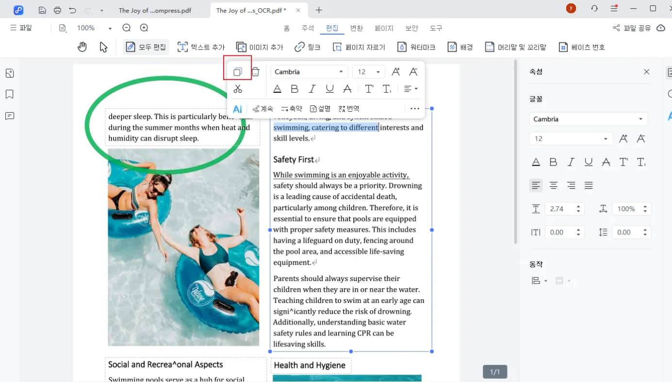 완료 후에는 마우스로 텍스트 선택이 가능한지 꼭 확인해 보세요.