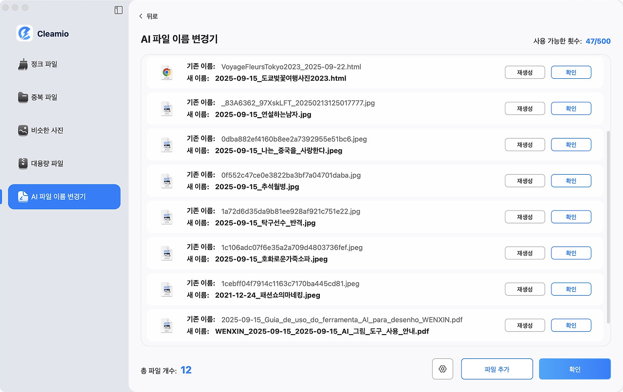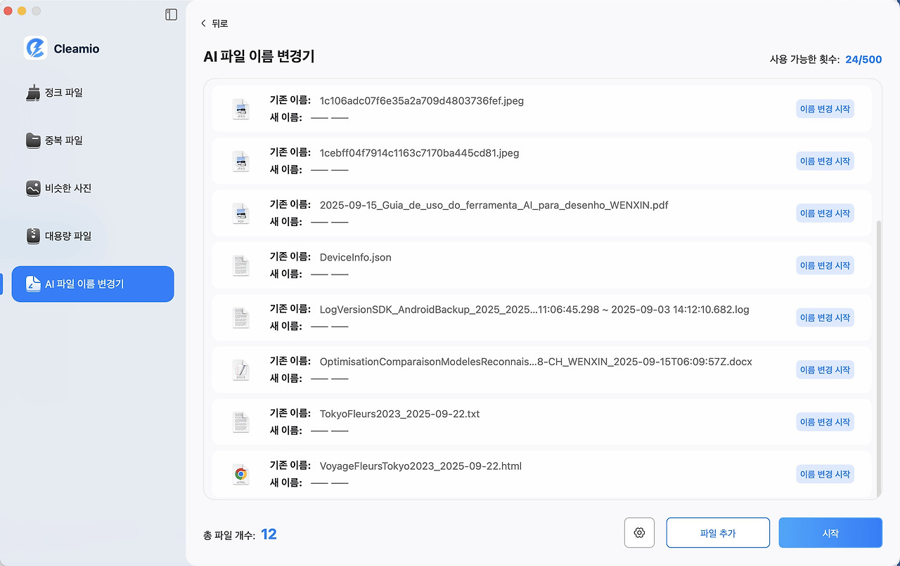 Mac에서 여러 파일을 자주 이름 변경한다면, 전문적인 macOS 파일 이름 변경기를 사용하는 것이 가장 빠른 방법입니다. Tenorshare Cleamio와 같은 전문 파일 이름 변경기는 게임 체인저입니다. 이 올인원 도구는 Mac 정리 기능뿐 아니라 AI 기반 파일 이름 변경 기능을 내장하고 있습니다. 콘텐츠, 날짜, 패턴에 따라 이름을 자동으로 제안해, 이미지 자동 이름 변경이나 대량 파일 이름 변경에 이상적입니다.
