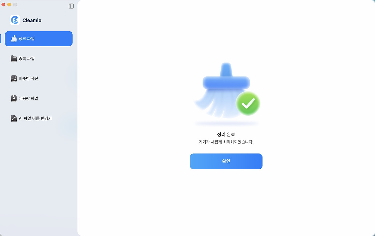 3. 몇초만에 정리가 완료됩니다. 더 빠른 Mac을 즐기세요. 또는 대용량 파일 찾기, 유사 사진, 중복 파일, Mac 성능 모니터링 등의 다른 기능을 계속 사용할 수도 있습니다.