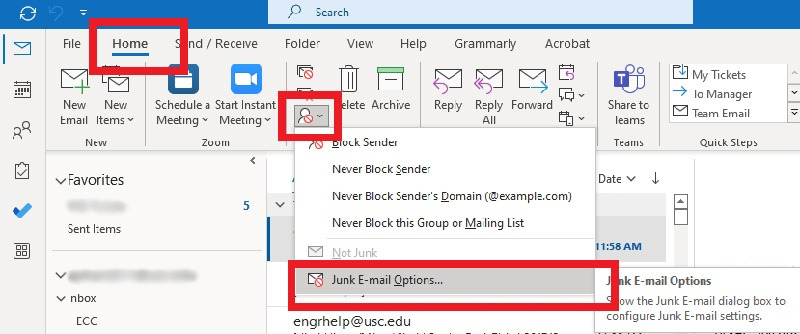 3. 예방을 위해 필터를 활성화합니다: 상단 메뉴의 "Home" > "발신자 차단" 아이콘 > "정크 메일 옵션" > "차단된 발신자"에서 정크 발신자를 추가합니다.