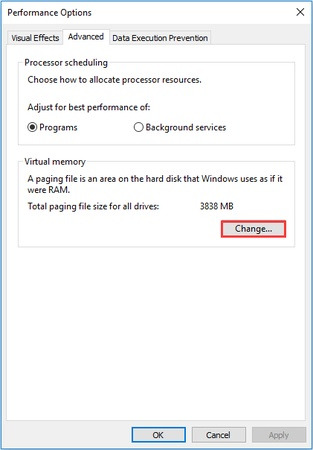 3단계: "고급"으로 이동한 다음 "가상 메모리"에서 "변경"을 선택합니다.