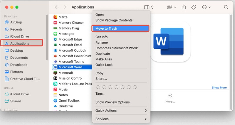 응용 프로그램 폴더에서 삭제할 앱을 휴지통으로 이동한 뒤 휴지통을 비우면 앱 본체가 제거됩니다.