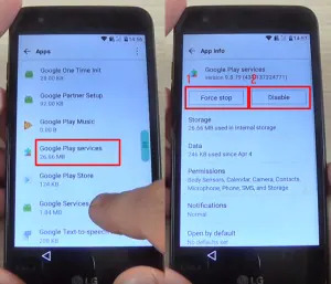 - 이전 페이지로 돌아가 "Google Play 서비스"를 찾아 강제 종료한 후 사용 중지(Disable)합니다.