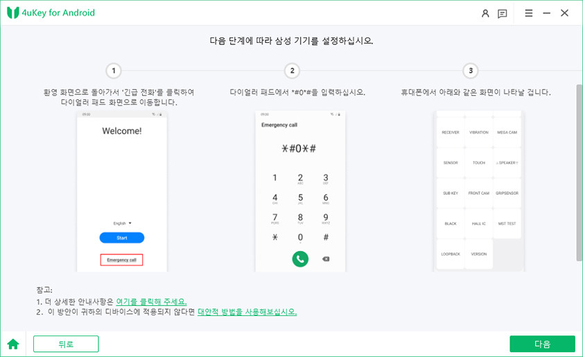 - 이제 화면 안내에 따라 진행합니다. 먼저 웰컴 화면으로 돌아가 "긴급 통화"를 누른 뒤 *#0*# 을 입력합니다. 기기가 진단 모드로 진입하면 "다음"을 클릭하세요.