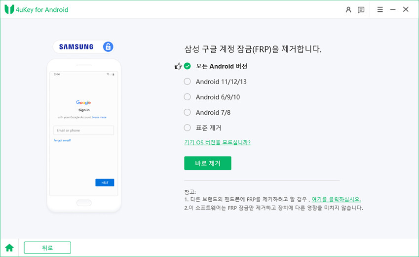 아래는 4uKey for Android를 통해 삼성 기기에서 FRP를 우회하는 단계입니다:
